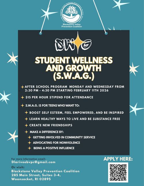 S.W.A.G. stands for Student Wellness And Growth. It is an after school program for high school youth of Woonsocket. The program focuses on community engagement, leadership and life skills, with the mission to empower young minds to make healthy, substance-free decisions.
